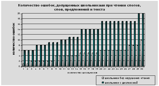 Принимаем Н1(р£0,05). Вывод: уровень развития речезрительных функций у школьников с дислексией, допустивших ошибки, выше, чем у школьников с дислексией, не допустивших ошибки (р£0,05). Школьники без речевой патологии задания данного блока выполнили без ошибок, что свидетельствует о сформированности речезрительных функций у данной категории детей. 3.7 Сравнительный анализ исследования процесса чтенияАнализ результатов исследования характера чтения слогов, слов, предложений и текста позволяет заключить, что у школьников с дислексией имеются значительные трудности в овладении техникой чтения. У 60% школьников чтение является побуквенным, а у 40% школьников – послоговым. У нормально развивающихся школьников чтение является словесно-фразовым, однако малознакомые или редко встречающиеся слова нормально развивающиеся школьники читали по слогам. Анализ результатов исследования чтения слогов, слов и предложений позволил заключить, что младшие школьники с дислексией легче всего читают прямые и обратные слоги. Наибольшие трудности у них вызывают слоги со стечением согласных и слоги с мягким знаком и гласными второго ряда. Так, например, слог лье школьники читали как ле, лее, слог цю читали как ци, цу, слог ющ читали как юш. Слово красна Данила С. прочитал как крсчная, а слово коллективный – как коллекцывный. Ксюша М. слово первоклассница прочитала как первовкасница. Слово ловил в предложении «Дима ловил сачком бабочку» многие дети читали как ловит. Анализ ошибок, допущенных детьми с дислексией при чтении слов, предложений и текста (см. диаграмму 2) свидетельствуют о том, что у данной категории детей в большинстве случаев нарушены процессы фонематического и слогового анализа и синтеза, дифференциации фонем, а также ошибки согласования. Так, например, школьники вместо слова голова читали головка, внученька – вместо внучка, мот – вместо том, кусочеки, кусочик – вместо кусочки, высыкочил – вместо вскочил, языком – вместо языков, прости – вместо просит, бабочку – вместо бабушку, фотроточкой – вместо форточкой. Ошибки согласования проявлялись в следующем: согласование в роде (два синички, побурели трава), в числе (тоненьким клювами, черный галстучки). Ошибки школьников без нарушения чтения были связаны с правильностью выбора ударения (например, вЫшивают, лОвил, занАвеску, Осенний), а также с добавлением звуков, принадлежащих к названиям букв (например, птэицы, кусочеки). Кроме того ошибки у данной категории детей заключались в неправильной смысловой догадке (например, болталась – вместо болтать, не совать – вместо не совала, а мясо – вместо а на мясе). Статистический анализ данных по критерию Манна-Уитни показал следующее. Гипотеза: Но – показатели состояния техники чтения у школьников с дислексией не ниже, чем у школьников с нормальным речевым развитием. Н1 – показатели состояния техники чтения у школьников с дислексией ниже, чем у школьников с нормальным речевым развитием. Были получены следующие результаты. n1=6,6,6,8,8,8,9,9,9,10,10,11,11,11,14,14,14,14,14,17,17,17,17,17,17,17,17,17,20,20.