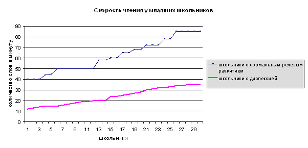 Анализ результатов исследования скорости чтения показал, что у многих школьников с дислексией низкая скорость чтения. В отличие от школьников с нормальным речевым развитием, у которых в среднем скорость чтения варьируется от 56 слов в минуту до 85, у школьников с дислексией скорость чтения варьируется от 15 слов в минуту, до 35 (см. диаграмму 3). Диаграмма 3 Статистический анализ результатов исследования скорости чтения по критерию Манна-Уитни показал следующее. Гипотеза: Но – показатели состояния скорости чтения у школьников с дислексией не ниже, чем у школьников с нормальным речевым развитием. Н1 – показатели состояния скорости чтения у школьников с дислексией ниже, чем у школьников с нормальным речевым развитием. Были получены следующие результаты. n1=12,13,14,15,15,15,16,17,18,19,19,20,20,20,24,24,25,26,27,28,30,31,32,32,33,34,34,35,35,35; n2=40,40,40,44,45,50,50,50,50,50,50,50,58,58,60,60,65,65,68,68,72,72,72,78,78,85,85,85,85,85.