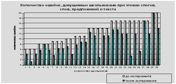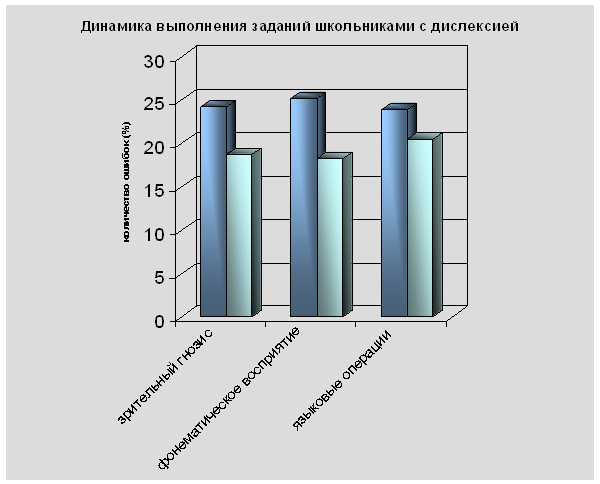 По результатам, полученным при исследовании, можно сделать вывод о том, что в ходе занятий с логопедом у детей улучшилась слухо-речевая память, речевое внимание, дети стали более осознанно употреблять разнообразные грамматические конструкции (см. диаграмму 6). Как видно из диаграммы, у детей улучшились показатели, отражающие уровень сформированности таких процессов, как: · зрительный гнозис; · дифференциация фонем; · языковые операции анализа и синтеза. По результатам эксперимента, школьники с дислексией стали допускать единичные ошибки при дифференциации слов-квазиомонимов. Кроме того, некоторые школьники с нарушением чтения стали лучше определять количество слов в предложении. Таким образом, коррекционная работа, направленная на развитие и уточнение пространственно-временных представлений, развитие зрительного, слухового восприятия и активного устойчивого внимания, памяти и словесно-логического мышления способствовала развитию у детей экспериментальной группы овладения навыком чтения. Отмечается увеличение числа успешно справившихся с заданиями детей. Так, у многих детей улучшились результаты технического чтения. Улучшилась память школьников, что свидетельствует об улучшении понимания прочитанного (76% школьников вместо 43% отвечали на вопросы по тексту, смогли правильно назвать главного героя и основные события рассказа, однако еще наблюдаются трудности при запоминании подробностей рассказа. У них наблюдалось сохранение логики последовательности событий, однако требуется продолжение работы по расширению используемых в речи синтаксических конструкций). Коррекционная работа по формированию звукопроизношения, развитию фонематического слуха, фонематического анализа и синтеза слов, фонематических представлений, развитию грамматического строя речи, расширению словарного запаса, обогащению активного словаря и формированию связной речи была эффективна. Работа по развитию звукового и слогового анализа оказалась особенно эффективной в отношении умения детей анализировать звуко-слоговую структуру слова. По результатам, полученным при повторном исследовании, можно сделать вывод о том, что в ходе формирующего эксперимента у детей улучшилась слухо-речевая память, речевое внимание, дети стали более осознанно употреблять разнообразные грамматические конструкции, пользоваться предлогами и развития смысловой целостности и лексико–грамматического оформления высказывания. Заключение Нарушение чтения является самой распространенной формой речевой патологии у младших школьников. Причины дислексии могут быть органические и функциональные биологические и социальные. Дислексия может быть связана с длительными соматическими заболеваниями детей в ранний период их развития, а так же с неблагоприятными внешними факторами (неправильная речь окружающих, двуязычие и т. д.) Симптоматика дислексии у младших школьников с нарушением речи сложна и многообразна, как правило, нарушения чтения сопровождаются нарушениями лексико-грамматического строя речи. Клиническая характеристика детей, страдающих дислексией чрезвычайно разнообразна. Чаще всего дислексия проявляется в структуре сложных нервнопсихических и речевых расстройств. Нарушение чтения у детей с относительно сохранным интеллектом (не имеющих умств