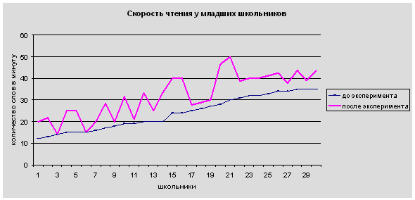 Принимаем Н1(р£0,05). Вывод: показатели состояния техники чтения у школьников с дислексией после эксперимента ниже, чем до эксперимента (р£0,05). Анализ результатов контрольного среза исследования скорости чтения показал, что у многих школьников с дислексией улучшилась скорость чтения. Как видно из диаграммы 5, скорость чтения у нескольких школьников данной группы возросла до 50 слов в минуту. Лишь у двоих школьников скорость чтения осталась прежней. Диаграмма 5