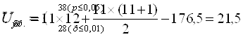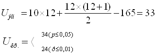 Где: n1,2 – количество значений выборок nx – количество значений признаков выборки с большей суммой рангов åRx – большая сумма рангов Гипотеза: Но – расхождение между уровнем сформированности фонематического восприятия у школьников с дислексией и у школьников с нормальным развитием незначительное. Н1 – расхождение между уровнем сформированности фонематического восприятия у школьников с дислексией и у школьников с нормальным развитием значительное. Таким образом, мы получили следующие результаты. n1 =13,17,20,27,30,33,47,53,60,63,77; n2 = 1,1,2,3,3,3,5,8.