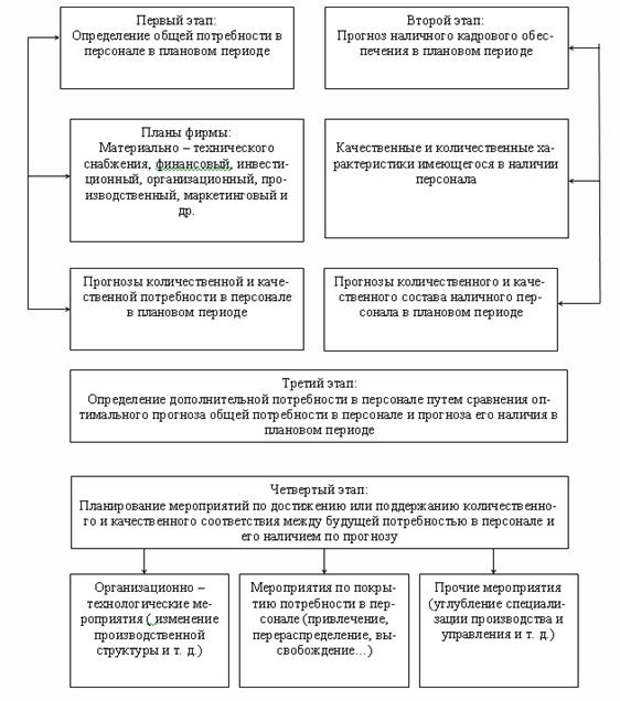 Рисунок 1.3 – Схема японской модели служебного роста управленческого работника Современный уровень управления персоналом требует планирования карьеры каждого управленческого работника. Практика планирования карьеры способствует повышению уровня компетенции сотрудников, являясь мощным стимулирующим фактором. 1.8 Кадровое планирование организации Основная задача планирования персонала – это «перевести» имеющиеся цели и планы организации в конкретные потребности в квалифицированных служащих, т.е. вывести неизвестную величину необходимых работников из наличного уравнения планов организации; и определить время, в которое они будут затребованы. Кадровое планирование – это постановка целей в области управления персоналом, а также определение сопутствующих этим целям задач, стратегий и мероприятий, направленных на своевременное удовлетворение потребности организации в персонале надлежащего количественного и качественного состава, повышение эффективности труда, развитие способностей работников, создание достойных условий труда, обеспечение занятости. Одна из сложнейших задач управления человеческими ресурсами – планирование объёма этих ресурсов, необходимого для успешного функционирования организации. Факторы, влияющие на кадровое планирование: · требования производства, стратегия развития предприятия; · финансовые возможности предприятия, определяемый им и допустимый уровень издержек на управление персонала; · количественные и качественные характеристики имеющегося персонала и направленность их изменений в перспективе и др.; · ситуация на рынке труда (количественные и качественные характеристики предложения труда по профессиям предприятия, условия предложения); · спрос на рабочую силу со стороны конкурентов, складывающийся уровень заработной платы; · влиятельность профсоюзов, жесткость в отстаивании интересов работников; · требования трудового законодательства, принятая культура работы с наемным персоналом и др. Кадровое планирование в организации преследует следующие цели: · получить и удержать людей нужного качества и в нужном количестве; · наилучшим образом использовать потенциал своего персонала; · быть способной предвидеть проблемы, возникающие из-за возможного избытка или нехватки персонала. Задачи кадрового планирования: · анализ состояния рынка труда и тенденции его изменения в рассматриваемый период; · разработка процедуры кадрового планирования, согласованной с другими его видами; · организация эффективного взаимодействия между плановой группой кадровой службы и плановым отделом организации; · проведение в жизнь решений, способствующих успешному осуществлению стратегии организации; · содействие организации в выявлении главных кадровых проблем и потребностей при стратегическом планировании; · оценка затрат на формирование и поддержание штатов, а также на реализацию мероприятий, предусмотренных кадровой политикой; · улучшение обмена информацией по персоналу между всеми подразделениями организации. Уровни кадрового планирования: · стратегическое; · тактическое; · оперативное. Черты стратегического кадрового планирования: · проблемно-ориентированный, долгосрочный характер; · ориентированность на конкретные проблемы; · высокий уровень зависимости от внешних факторо