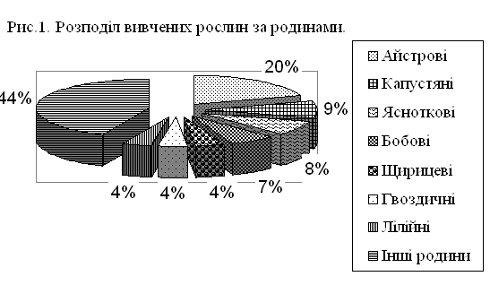 Флористичний аналіз показав, що серед клумбових рослин добре представлені родини Айстрових 28%, Бобових 10%, Капустяних 8%, Ясноткових 7%, Щирицевих 6% і Гвоздичних 5%.