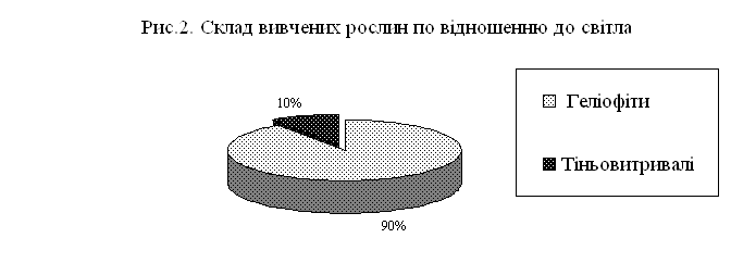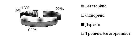 Аналіз діаграми показує, що доля тіньовитривалих видів складає лише 10%.Тобто існуючий асортимент розрахований на вирощування рослин лише на добре освітлених ділянках. Для успішного поширення клумбового озеленення в місця із слабим освітленням (таких місць завдяки інтенсивному будівництву стає все більше) було складено спеціальний список тіньовитривалих рослин: ► Барвінок малий ► Вербозілля лучне ► Горлянка повзуча, ф. пурпурова ► Драцена сарматська ► Колеус (жовто-зелені сорти) ► Папороті (Страусове перо звичайне ) ► Сансев’єра (карликові сорти) ► Сеткреазія пурпурна ► Тис ягідний ф. колоновидна ► Хлорофітум чубатий ► Хоста (велике різноманіття сортів та видів) Класифікація життєвих форм за Раункієром не підходить до тропічних рослин, яких багато серед клумбових рослин. Тому ми поділили вивчені рослини на однорічні, багаторічні, деревні та тропічні багаторічні відповідно до класифікації Хессайона [34].