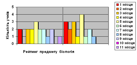 Як на етапі підготовки, так і на етапі проведення діти виявили високий рівень зацікавленості. Подібні завдання вчитель може використовувати і в якості „розминки” на початку уроку, і при перевірці Д/з, і при узагальнені матеріалу. Після проведення цього уроку у 8 класі відбулася бесіда з учнями, що до враження від цього уроку. Школярі відповіли, що було багато завдань – це важко, але всі вони були різні і цікаві. Їм сподобалось працювати по групах. Після цього на етапі констатуючої частини, були створені частково авторські розробки уроків з розділу “Загальна біологія”, продумана методика їх проведення, розроблено ряд завдань для самостійної роботи учнів. Процес підготовки до нього почався за 2 тижні до терміну його проведення, як виконання відсроченого домашнього завдання. Разом з учнями ми обговорили мету та завдання цього семінару, обсяг інформації та розподілили ролі. Семінар був побудований як рольова гра і через те консультації проводилися у трьох окремих групах, для того, щоб учні не втратили цікавість до навчальної інформації. Наші спостереження підтвердили це: учні були дуже уважні, активні, відповідально ставилися до роботи своєї групи, «вболівали» за результати роботи. Організовуючи таким чином навчально-пізнавальну діяльність школярів на учитель формує та розвиває у них навички самостійної роботи, випрацьовує уміння самостійно формулювати висновки та узагальнення, виділяти головне, не перевантажувати пам’ять тим, що навряд чи знадобиться їм у житті. На початку нашої практики на етапі констатуючої частини нашого педагогічного дослідження та наприкінці її проведення, нами було проведено два анкетування за однією формою у 8-А класі, кількість учнів у якому становить –28 (кількість учнів, які приймали участь у анкетуванні кожен раз становила 21, сім учнів були відсутніми на той момент у класі, у школі, або не схотіли (не змогли) прийняти участь у згаданому анкетуванні), за такими питаннями: 1) Розмістіть по порядку особистої значимості навчальні предмети розташовані нижче: укр.мова, укр. літ, рос.мова, іноз.літер., фізкультура, алгебра, геометрія, фізика, праця, біологія, історія, географія. 2) Скільки часу Ви готуєте д/з з біології: 15 хв., 30 хв., 1год., більше 1 год. 3) Які джерела Ви використовуєте під час підготовки д/з з біології: стабільний підручник, наукові видання, наукова література, інтернет. 4) Які однорічні рослини використовують для озеленення м. Харкова ? 5) Які рослини, занесені до Червоної книги України Ви знаєте ? 6) Які форми контролю знань умінь та навичок Вам подобаються більше? Учні справилися з анкетою, вказували на те, що в минулому навчальному році було подібне анкетування і вони вже частково змінили своє ставлення на більш позитивне. Діаграму, яка фактично відбиває зміну рейтингу предмету “Біологія” в середовищі учнів 8-А кл. наведено нижче. До експерименту Після експерименту