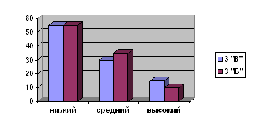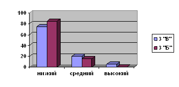 Таблица 3 показывает, что из 40 учащихся 5% 3 «В» класса и 0% 3 «Б» класса показали высокий уровень; 20% учащихся 3 «В» класса и 15% учащихся 3 «Б» класса показали средний уровень; 75% 3 «В» класса и 85% 3 «Б» класса показали низкий уровень сформированности данного умения.