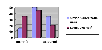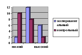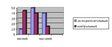 Рис. 6. Распределение испытуемых по уровням сформированности умения анализировать использование способов выражения этикета с позиции уместности и целесообразности На основании выше изложенных данных были сделаны следующие выводы: · По результатам второго среза 2 учащихся экспериментального класса и 11 учащихся контрольного класса имеют низкий уровень сформированности речевого этикета. При первом срезе низкий уровень был замечен у 13 учащихся экспериментального класса и у 10 учащихся контрольного класса. Таким образом, в экспериментальном классе данный уровень повысился на 55%, а в контрольном на 5%. · По результатам второго среза 11 учащихся экспериментального класса и 7 учащихся контрольного класса имеют средний уровень сформированности речевого этикета. При первом срезе средний уровень был замечен у 6 учащихся экспериментального класса и у 5 учащихся контрольного класса. Таким образом в экспериментальном классе данный уровень повысился на 25%, а в контрольном на 10%. · По результатам второго среза 7 учащихся экспериментального класса и 3 учащихся контрольного класса имеют высокий уровень сформированности речевого этикета. При первом срезе высокий уровень был замечен у 2 учащихся экспериментального и контрольного класса. Таким образом в экспериментальном классе данный уровень повысился на 25%, а в контрольном на 5%. Динамика изменений в уровне сформированности речевого этикета представлена на рисунках 6 и 7.