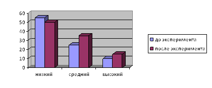 Рис. 7. Уровни сформированности речевого этикета у учащихся контрольного класса Из рисунка 6 видно, что в экспериментальном классе произошли значительные изменения уровня развития речевого этикета у младших школьников. У большинства учащихся возросла доля со средним уровнем развития речевого этикета и высоким уровнем. Из рисунка 7 видно, что в контрольном классе изменения незначительны. По прежнему преобладает низкий уровень развития речевого этикета. В итоге констатирующего среза мы сделали вывод, что выдвинутая вначале нашего исследования гипотеза подтвердилась, и в результате проведения кружка «Я умею общаться» для учащихся экспериментального класса степень сформированности речевого этикета значительно повысилась, в отличие от контрольного класса, где преобладающим остался по-прежнему низкий уровень. В результате расчетов мы пришли к выводу, что существует статистическая разница в экспериментальном классе до формирующего эксперимента и после него по уровню сформированности речевого этикета. Следовательно, использования кружка «Я умею общаться» является эффективным. Библиография: 1.Азбука джентльмена Под ред. В.А. Сластенина. – 3-е изд., стер. – М.: Издат центр «Академия», 2004.- 264 с. 2.Анисимова И.М. Хорошие манеры для детей. – СПб., 1996 г. 3.Бондарь Ф.Т. «Воспитание сознательной дисциплины культуры поведения у мл. школьников».: Вологда. 1984 г. 4.Безруких М.М., Макеева А.Г., Филипова Т.А. Все цвета, кроме чёрного. Учись понимать других: Раб. Тетр. Для 3 кл. - М.: Вентана- Граф, 2002. - 48 с: ил. 5.Байбурин А.К., Топорков А.Л. У истоков этикета. – Л., 1990 г. 6.Богданова А.К., и Петрова В.И. Методика воспитательной работы в начальных классах. М., «Просвещение», 1975. 7.Воспитание сознательной дисциплины и культуры поведения школьников: Методические рекомендации учителям – стажерам и студентам – практикантам общеобразовательной средней школы. Под редакцией Гордина Л.Ю. и Козлова Э.П. – 2-е издание. Таганрог 1981 г. 10. Воспитание школьников. Научно – методический журнал. №2 2006 г. Стр. 46., «Азбука нравственного образования» В. Петрова, И. Хомякова, Т. Стульник. 11. Воспитание школьников. Научно – методический журнал. №8 2004 г. Стр. 43., «Азбука нравственности» Э. Козлов, В. Петрова, И. Хомякова. 12. Газета для учителей и организаторов внеклассной работы начальных и старших классов. «Досуг в школе» №12 2005 13. Головнева Е.В. Теория и методика воспитания: Учеб. пособие О.Г. Костылева, И.Г. Лукина. – М.: Чистые пруды, 2006. – 32 с. -). 17. Курочкина И.Н. История Российского этикета. – М.; 1998 г. 18. Курочкина И.Н. Современный этикет: Методическое пособие для преподавателя. – Калуга, 1993 г. 19. Курочкина И.Н. «Этикет для детей и взрослых» Москва: Издательский центр «Академия», 2001 год. 20. Карнеги Д. Как завоевывать друзей и оказывать влияние на людей. – М., 1990 г. 21. Кульневич СВ., Лакоценина Т.П. Воспитательная работа в современной школе: от коллективизма к взаимодействию: Учебно-методическое пособие. Для учителей и классных руководителей, студентов пед. учеб. заведений, слушателей ИПК. Изд. 2-е, доп. и перераб. – Воронеж, ЧП Лакоценин С.С. – 2006 22. Козлов Э., Петрова В., Хомякова И. Азбука нравственности. Воспитание школьников. 2005 №7 стр. 29. 23. Козлов Э., Петрова В., Хомякова И. Азбука нравственности. Воспитание школьников. 2004 №8 стр. 43. 24. Козлов Э., Петрова В., Хомякова И. Азбука нравственности. Воспитание школьников. 2