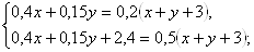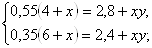 По условию задачи составляем уравнения: для 1 смеси 0,55(4+x)=2,8+ xy, для 2 смеси 0,35(6+x)=2,4+ xy. Итак, получаем систему уравнений:
