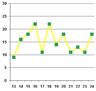 X – имя ребёнка, соответственно нумерации в таблице 2; Y – количество баллов График 6
