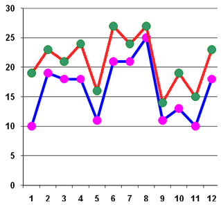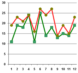 X – имя ребёнка, соответственно нумерации в таблице 1 и 3; Y – количество баллов Красный – результаты констатирующего этапа эксперимента; Синий – результаты контрольного этапа эксперимента График
