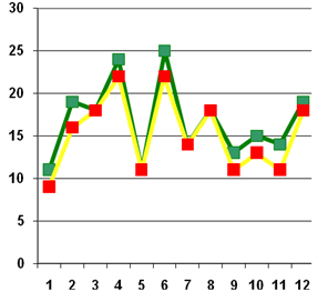 X – имя ребёнка, соответственно нумерации в таблице 2 и 4. Y – количество баллов Желтый – результаты констатирующего этапа работы детей контрольной группы; Зелёный – результаты контрольного этапа работы детей контрольной группы График 7