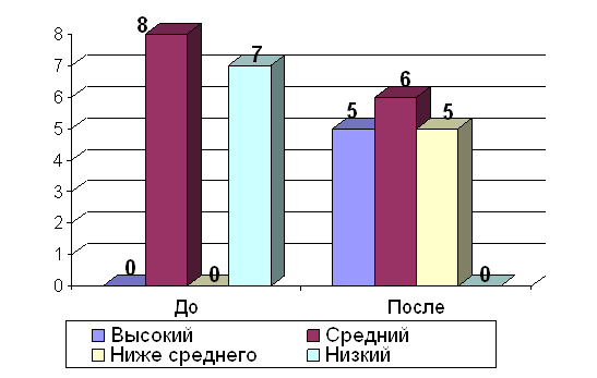 Рис.2. Сравнительный график уровня развития навыков чтения до и после обучающего эксперимента После обучающего эксперимента значительно возросла группа с высоким уровнем развития навыков чтения. При чтении учащиеся соблюдают основные интонационные требования. Техника чтения учащихся этой группы достаточна высока. Исчезла группа учащихся с низкими показателями. После коррекционной работы появилась группа с показателями выше среднего. Сюда вошли учащиеся навык чтения, которых нельзя назвать низким, т.к. по сравнению с началом работы произошли значительные качественные изменения: возросла техника чтения, сознательность, выразительность, улучшилась его правильность. Сводная таблица результатов обследования представлена в приложении 2 (Приложение 2). Вывод: Положительные тенденции при формировании навыков чтения у умственно отсталых учащихся подтверждают эффективность проведенного обучающего эксперимента. Однако следует подчеркнуть необходимость дальнейшего проведения коррекционной работы по совершенствованию навыков чтения. Это связано со стойкостью нарушений вследствие интеллектуального дефекта. Заключение Одной из актуальных проблем современной педагогики, характерной для всего мира, является проблема трудностей в обучении, и в частности – обучения чтению. Целью нашего исследования было изучение особенностей воспитания навыков чтения у учащихся с интеллектуальной недостаточностью 3 класса. Было изучено состояние проблемы в общей и специальной методической литературе, при этом были выявлены особенности воспитания навыков чтения у учащихся с недостатками интеллекта. Итак, полноценный навык чтения характеризуется следующими качествами: беглостью, выразительностью, осознанностью. Процесс формирования каждого качества у умственно отсталых учащихся протекает достаточно своеобразно. В дефектологической литературе, вопросы формирования навыков чтения у детей с умственной отсталостью, а также трудности протекания этого процесса раскрываются в работах М.Ф. Гнездилова, А.К.Аксёновой, В.Я.Василевской, Н.Г.Галунчиковой, А.И.Граборова, Р.С.Левиной, В.Г.Петровой, Н.К.Сорокиной, Р.И.Лалаевой и др. Также задачей выпускной квалификационной работы являлась разработка и апробация приемов воспитания навыков чтения с учётом психофизиологических возможностей умственно отсталых учащихся. В ходе констатирующего эксперимента было проведено обследование школьников 3 класса специальной (коррекционной) школы VIII вида по параметрам, оказывающим значительное влияние на процесс формирования навыка чтения. Экспериментальное исследование подтвердило выводы, основанные на анализе теоретических источников. Учащиеся с интеллектуальной недостаточностью испытывают значительные затруднения при освоении полноценного навыка чтения в силу разнообразных причин: нарушение произносительных навыков, слабость зрительного восприятия, недостаточность звукового анализа и синтеза, затруднения в понимании логических связей. На основе результатов обследования была организована коррекционная работа. При воспитании правильности чтения у умственно отсталых детей в качестве важного направления работы было выделено совершенствование звуко-буквенного анализа и синтеза, развитие умения прогнозирования текст, речевая зарядка. Пр