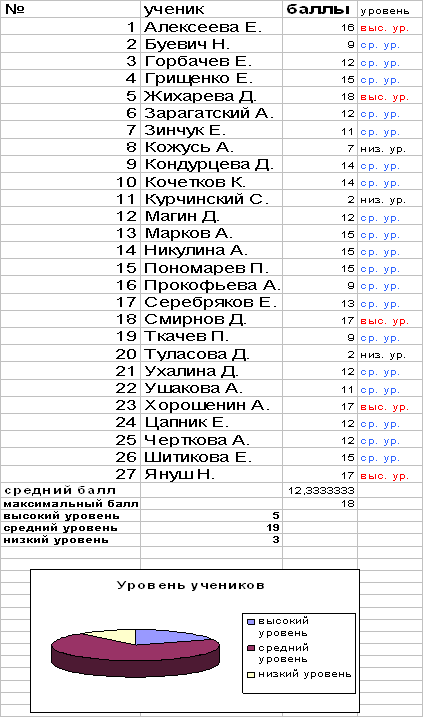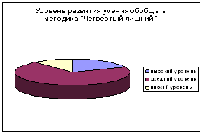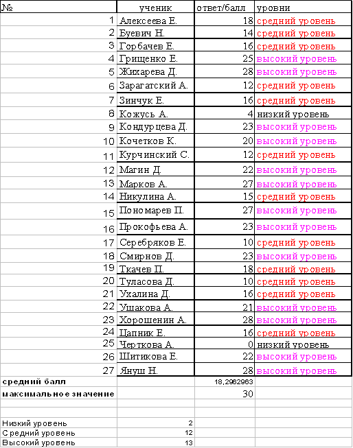Обработка теста №2 «Обобщения-2009» показали следующие результаты (таблица с обработанными результатами диагностики «Обобщения-2009» в приложении 2): В этом тесте определялся уровень обобщения и понятийного мышления. Результаты показали, что высоким уровнем операции обобщения овладело 13 учеников класса, что составляет большинство, а именно 48, 1% от всех учеников класса. Средний уровень у 12 учеников или 44, 4%. Низкий уровень у 2 учеников класса, что составляет 7, 4 % учеников. Средний балл в классе составляет 18, 3 или 61 %, что является хорошим результатом. В принципе можно судить. Что основная масса учеников справилась с заданием определения обобщающего понятия для группы слов.