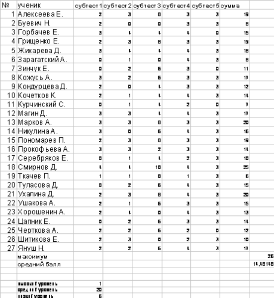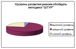 Результаты заключительной диагностики ШТУР показали уровень сформированности различных операций логического мышления (таблица с обработанными результатами диагностики ШТУР в приложении 3). Как говорилось в 1 главе, формирование обобщения взаимосвязано с другими мыслительными операциями, поэтому результаты данного теста нам также важны. Нормой для данного теста был показатель свыше 10, 5 балла – такой результат удалось показать 21 ученику в классе, что составляет 77, 7 % от общего числа учащихся в классе, причем 1 ученик показал высокий уровень сформированности логических операций – 25 баллов – этот результат уступает 1 балл максимальному результату за этот тест. Не удалось превысить планку в 10, 5 баллов 6 ученикам, что составляет 22, 2 % от общего количества учеников в классе. Данным ученикам тяжело дались задание на составление аналогий и осведомленность. Констатируя средний результат по классу, нужно отметить, что он составил 18, 3 балла, что намного превосходит результат, достаточный для определения нормы в данном возрасте – 10, 5 б.