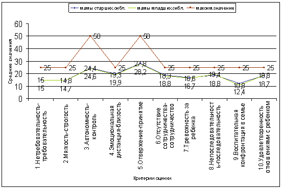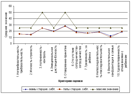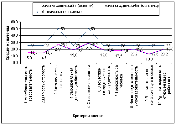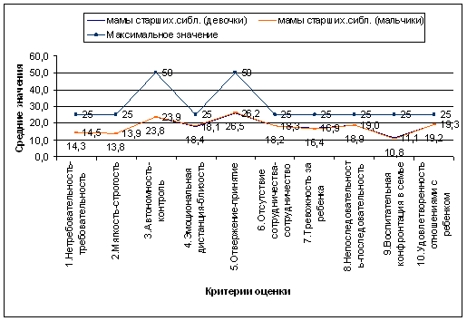 Рисунок 4. Средние показатели уровня выраженности критериев оценки в 3отношении матерей к старшим сиблингам, с учетом пола