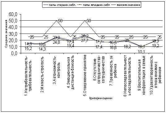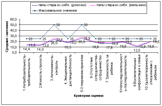 Рисунок 6. Средние показатели уровня выраженности критериев оценки в отношении отцов к старшим сиблингам, с учетом пола