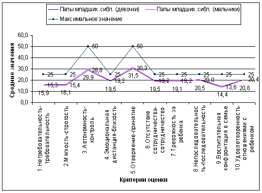 Рисунок 6. Средние показатели уровня выраженности критериев оценки в отношении отцов к младшим сиблингам, с учетом пола Приложение 5 Результаты опросника «Незаконченные предложения» детей младшего школьного возраста с учетом их пола и сиблинговой позиции