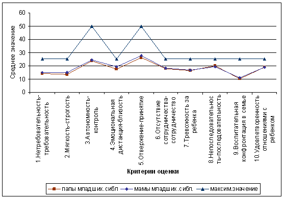 Рисунок 3. Средние показатели уровня выраженности позиции родителей к старшим сиблингам У родителей же младших сиблингов выявлены статистически значимые различия по шкалам: «Эмоциональная дистанция – эмоциональная близость ребенка к родителю» и «Отвержение – принятие ребенка родителем» (U=286,5, при р=0,024 и U=309,5, при р=0,058 соответственно). То есть мамы младших сиблингов в большей степени принимают личностные и поведенческие проявления ребенка и как им кажется, младший ребенок более близок к ним (см. Рисунок 4).