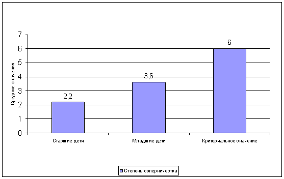 Рисунок 5 Средние показатели степени выраженности соперничества детей с разной ролевой позицией Как видно из представленных данных, степень соперничества у детей, занимающих старшую сиблинговую позицию низкая (2,2). На наш взгляд, это связано с тем, что старший ребенок был, до определенного момента, единственным и порция родительской любви и внимания к его личности оказалась достаточной при появлении младшего сиблинга. При этом у младших детей ярче прослеживается конкуренция (3,6), так как второй ребенок в семье никогда не переживает ситуации единственного ребенка, которому отданы все внимание, любовь, безоговорочное восхищение и он «обречен» на соперничество. Второму ребенку с самого начала задает темп его старший брат или старшая сестра: ситуация стимулирует его побивать рекорды старшего сиблинга. Благодаря этому нередко темп его развития оказывается более высоким, чем у старшего ребенка. В результате второй ребенок вырастает соперничающим и честолюбивым. Его стиль жизни определяет постоянное стремление доказать, что он лучше своего старшего брата или сестры. Таким образом, для младшего ребенка характерна ориентация на достижения и часто подражание. Можно предположить так же влияние следующего фактора: по отношению к младшему школьному возрасту испытуемых (средний возраст 8 лет), средний возраст младших сиблингов (3,2 года), а старших сиблингов (13,2 лет). Таким образом, разница в возрасте между сиблингами (4,8 лет и 5,2 лет) что является, по мнению таких авторов, как: А. Фромм, Р. Ричардсон, Г. Хоментаускас и др., а именно (4-5 лет), оптимальным возрастом для низкой степени соперничества. В целом, уровень соперничества у детей, занимающих старшую и младшую сиблинговую позицию, недостаточно выражен, т.к., оба показателя ниже критериального значения (6). Более детальный анализ уровня соперничества, показал что, несмотря на преобладающее большинство сиблингов с разной ролевой позицией имеют низкий уровень соперничества (60% и 53,3% старшие и младшие сиблинги соответственно), при этом мы обнаружили группы детей со средним и высоким уровнем данного показателя, с учетом пола испытуемых. Применив критерий φ* Фишера (угловое преобразование Фишера) для сопоставления двух выборок по частоте встречаемости интересующего нас параметра, мы получили следующие результаты. При сравнении общих показателей в группах старших и младших сиблингов, значимым оказался лишь высокий уровень соперничества у младших сиблингов (φ*=1,57, р=0,05) (см. Таблицу 9). Таблица 9 Значимые показатели соперничества при сопоставлении двух выборок детей, с учетом пола и сиблинговых позиций