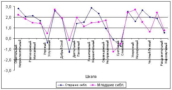 Рисунок 6. Показатели характеристик при восприятии старшего и младшего сиблингов Можно отметить на уровне тенденции положительный характер оценок, как старших, так и младших сиблингов. При математической обработке результатов, были выявлены следующие различия: старший сибс воспринимает младшего брата (сестру) более разговорчивым, решительным, энергичным и общительным (см. Таблицу 12). Таблица 12. Значимые характеристики образа старшего и младшего сиблингов