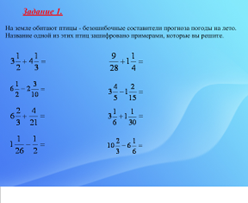 Урок по теме «Понятие обыкновенной дроби. Действия с обыкновенными дробями» Данный урок с одной стороны подытоживает знания, полученные учащимися в курсе математики 5–6 классов, по теме «Обыкновенная дробь», а с другой стороны систематизирует и расширяет их. В уроке в наглядном виде представлены все виды действий с обыкновенными дробями, понятие обыкновенная дробь. Представлен ряд задач с готовыми решениями и задачи для самостоятельного выполнения. Спектр заданий очень широк и определяет использование интерактивной доски.