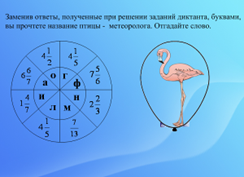 наглядность математика дробь обучение интерактивный По вертикали: 1. Деление числителя и знаменателя на одно и то же натуральное число. 2. Дробная черта – это знак… 3. Число, показывающее, на сколько равных частей разделено целое. 4. Дробь, у которой числитель меньше знаменателя. По горизонтали: 2. Отношение двух натуральных чисел. 5. Наука, изучающая действия с числами. 6. Так в обыкновенной дроби называется делимое. 7. Дробь записанная с помощью черты. Ответы: По вертикали: 1. сокращение; 2. деления; 3. знаменатель; 4. правильная По горизонтали: 2. дробь; 5. математика; 6. числитель; 7. обыкновенная Использование интерактивной доски помогает осуществить организацию повторения учебного материала в более яркой и динамичной форме. Интерактивная доска – идеальное средство при подготовке к уроку-игре. Она позволяет в достаточной мере реализовать идею игровой ситуации на уроке и разнообразить формы предъявления заданий учащимся. Кроме того, экономится время на уроке в момент предъявления задания учащимся, так как нет необходимости писать задания на доске и вытирать доску после работы очередного ученика. Интерактивная доска способствует высокой заинтересованности и активности учеников, уроки проходят динамичнее, знания усваиваются лучше, и повышается успеваемость. Интерактивная доска позволяет конструировать различного вида задания, использование которых включает в активную деятельность даже тех учащихся, которые привыкли «отсиживаться» на уроке. Эти задачи на самом деле очень разнообразны; в качестве примера можно привести задания на логическое упорядочение элементов посредством их перетаскивания; сдвиг «шторки», прикрывающей правильный ответ; графическое создание образов подвижных элементов и площадки их действия; и многое другое. Интерактивная доска предоставляет уникальные возможности для работы и творчества учителя и ученика, она – ценный инструмент для обучения математике, повышения интереса к предмету. Благодаря подаче материала с помощью интерактивной доски, лучше и быстрее учащиеся понимали тему, вырабатывались практические умения и навыки, закреплялись полученные знания. Заключение В ходе исследования все поставленные задачи были решены. 1. Проведен анализ психолого-педагогической литературы, в ходе которого было выявлено, что, наблюдение является осмысливающим и целенаправленным восприятием. У ребенка дошкольного и младшего школьного возраста наблюдение носит схематический характер. В подростковом возрасте наблюдение за предметами и явлениями начинает строиться на внутренней связи частей и сторон, подросток учится интерпретировать воспринимаемое, объяснять его. Так же было выявлено, что наглядность является одним из главных средств обучения школьников на протяжении всего учебно-воспитательного процесса. Использование наглядности на уроках математики в 5–6 классах обусловлено психофизиологическими особенностями учащихся данной возрастной группы. Принцип наглядности в обучении используется уже давно. Об его эффективном действии в процессе обучения и воспитания говорил еще великий польский дидактик и ученый Я.А. Коменский; Песталоцци признавал высшим основным принципом обучения – наглядность; великий русский педагог К.Д. Ушинский видел в наглядности одно из условий, которое обеспечивает получен