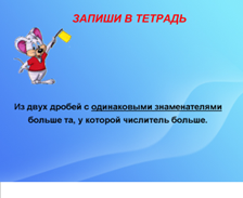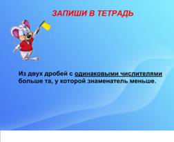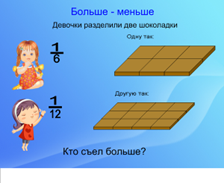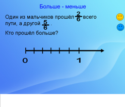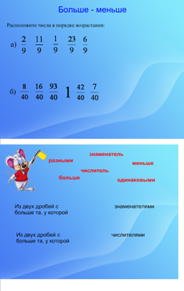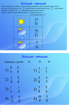 Урок по теме «Сравнение обыкновенных дробей» На данном уроке учащиеся знакомятся с правилами сравнения дробей. На этапе закрепления изученного материала текст задания представлен на экране, а решение может быть как частично разобрано, так и выведено учащимися на уроке самостоятельно. Объекты, созданные в режиме интерактивной доски, являются подвижными – их можно передвигать в нужном направлении и изменять линейные размеры.