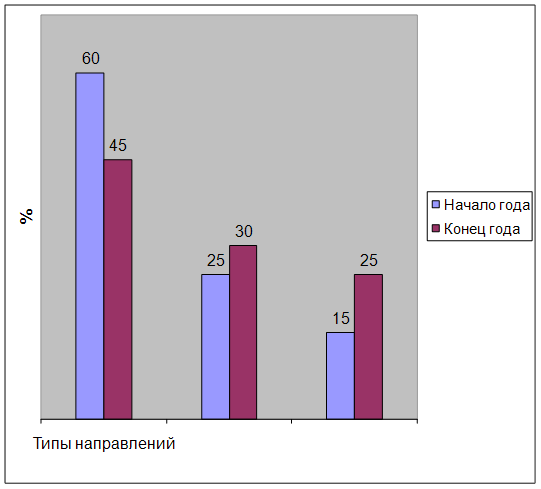 В конце эксперимента: наблюдаем тенденцию уравнивания типов направленностей (40%,30%, 25%), что характеризует позитивность в складывающемся стиле педагогической деятельности, поскольку в педагогической деятельности необходимо иметь направленность на совместные дела, при решении совместных задач.