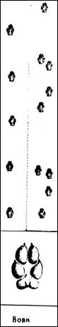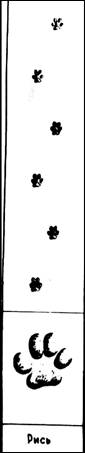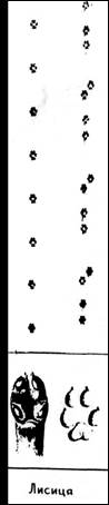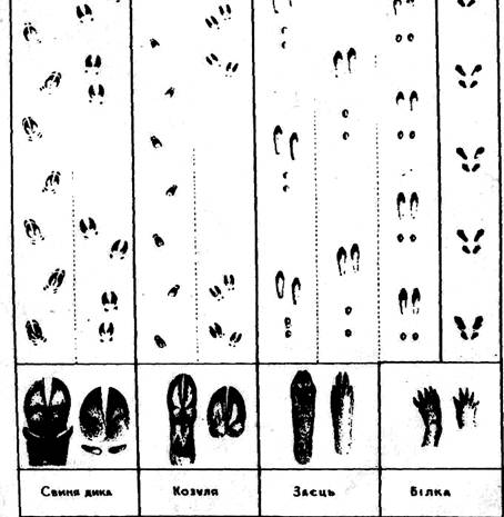 Кінцівки котячих приблизно одинакової будови пальцехідні, передні мають п'ять пальців, задні — чотири. На пальцях пазурі, сильно вигнуті, дуже гострі, втяжні. Рись має відносно довгі, товсті і сильні кінцівки. Крок її сягає до 80 см. Сліди кінцівок майже округлі, приблизно 7х7см. Стопа має великі і м'які пальцеві подушечки, що як і п'ятки, помітні на слідах. При раптових стрибках можна побачити відбитки пазурів. Сліди рись прокладає рівно, відхиляючи їх трохи на боки. Вовк. Вовк має добре розвинені пальцехідні кінцівки, озброєні досить тупими, невтяжними кігтями. Сліди його кінцівок подібні до собачих, лише дещо довші. У вовка передні пальці висунуті до переду. На передній ступні розміром 9,5x5,5 см помітна пара кігтів, а на задній розміром 10x7,5 см — чотири кігті. Середні пальці не розхиляються, як у собаки. У вовка досить виразно відбиваються подушечки пальців. Ідучи вільним кроком, або біжучи підтюпцем, він залишає сліди на одній лінії, а сліди собаки відхиляються на боки. Прямолінійність вовчих слідів виникає з того, що ідучи кроком або риссю, вовк вступає лівою задньою ногою в слід правої передньої ноги, а в слід лівої передньої — правою задньою ногою. Свіжий слід вовка на снігу має «поволоку», тобто тонку риску від сліду до сліду. Утворюється вона тому, що вовк на ходу трохи волочить задні ноги. При стрибках відбитки чотирьох кінцівок укладаються у вовка боковим луком. Коли вовки біжать навіть ватагою, то ставлять лапи слід у слід. В такому випадку, щоб встановити їх кількість, необхідно дійти до того місця, де сліди розходяться. Найчастіше це трапляється на поворотах. Лисиця. Слід лисиці подібний до сліду собаки. Коли вона йде повільно (шнурує, йде ланцюжком), то залишає сліди по одній лінії, в той час як сліди у собаки дещо відхилені на боки. Якщо лисиця мчить кар'єром, розташування відбитків подібне до заячих із тією різницею, що три з них ідуть один за одним по прямій лінії, а четвертий дещо збоку, переважно відхилений і висунутий справа. Відбиток передньої лапки більший, ледь видовжений, розміром приблизно 6,2x4,7 см, а задньої розміром 6x4 см., більше видовжений. Переляканий звір переходить у кар'єр і робить стрибки завдовжки до 3,5 м. Білка. Усією своєю екологією білка нерозривно зв'язана з лісом і надеревним способом життя, тому має сильні і добре розвішені кінцівки. По землі рухається короткими стрибками. Сліди чотирьох кінцівок завжди вкупі, при цьому задні лапки розставлені ширше. Видовжені ступні з помітними пазурами, ширші до переду, розставлені на боки, під гострим кутом до лінії руху. На снігу сліди виступають дуже виразно і зауважити їх можна на короткій відстані, тоді коли переходить із дерева на дерево або запримітила на землі щось їстивного. Основний шлях, по якому рухається, це крони дерев. Відбитки, порівняно з величиною звіра, розставлені досить широко. Куниці — лісова і кам'яна. Куниці мають короткі і міцні ноги, їх слід на снігу можна легко розпізнати. У лісової ступні опущені густіше ніж у кам'яної, тому відбитки її пальців на сліду менш виразні, ніж у останньої Сліди спарені, із дещо висуненою протилежною парою кінцівок. У більшості випадків задні кінцівки попадають у відбитки передніх. При стрибках уклад слідів подібний до заячих, тільки сліди куниці менші і без відбитків пальців та кігтів. Рідко можна запримітити чотири відб