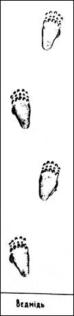 Заєць. Сліди зайця на снігу легко впізнати. Він багато стрибає і неспокійно поводиться біля корму, що необхідно мати на увазі при обліку на підставі висліджування. Передні кінцівки у зайця значно коротші від задніх і закінчуються п'ятьма пальцями із легко загнутими кінцями. Задні лапки особливої будови. Вони довгі, сягають до половини корпусу, сильні і закінчуються чотирма пальцями. Ступня задніх кінцівок перевищує довжину вуха. Завдяки такій будові заєць надзвичайно швидко стрибає і залишає на снігу специфічні сліди. А саме: перед передніми відбитками кінцівок бачимо відбитки ступень завдовжки до 180 мм. При втечі, коли стрибки довгі і енергійні, сліди задніх ступень дещо коротші, більше витискають сніг до заду. Інколи трапляються сліди, коли відбитки передніх кінцівок, розташовані не по одній лінії, а паралельно, широко. Заячі екскременти мають вигляд трохи сплющених кульок, діаметром приблизно 1,5 см, темно-коричневого кольору, а висушені — ясно-коричневого, матового, помітні волокна трав. Ведмідь. Сліди ведмедя характерні своєю величиною, тому їх легко відрізнити від слідів інших тварин. Кінцівки у нього цілком стопохідні, п'ятипалі, з великими і міцними невтяжними тупими пазурами. Слід ведмедя подібний до відбитка стопи людини, тільки ширший і трохи коротший. Помітні кінці пазурів. Сліди відхилені на боки. Лапи, особливо передні, ставить навскоси до середини (косолапий) і ходить переважно з переступом, рідко з недоступом. У випадку, коли ставить задню лапу у слід передньої, то можна завжди помітити неперекритий зовнішній краєчок нижнього відбитка. Коти (рись і кіт лісовий).