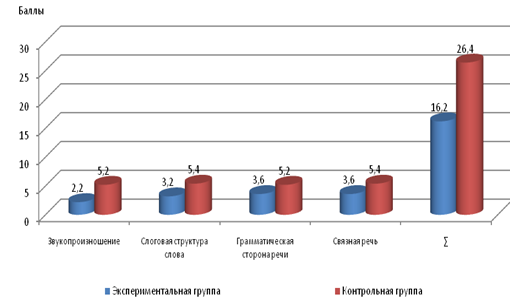 ∑ ср.: 16, 2 балла По полученным данным мы можем сказать, что наиболее страдает у детей экспериментальной группы звукопроизношение (2,2 балла) и слоговая структура слова (3,2 балла), что говорит о низком уровне речевого развития. Состояние развитие связной речи (3,6 балла) и грамматической стороны (3,6 балла) ближе к среднему уровню. К 6 – 7 годам значительное большинство детей с дизартрией при ДЦП способны к пересказу коротких текстов, составлению рассказов по сюжетным картинам, наблюдаемым действиям и пр., то есть к связным высказываниям. И все-таки эти высказывания очень значительно отличаются от связной речи детей с нормальным речевым развитием. Дошкольников с ДЦП отличают: недостаточное умение отражать причинно-следственные отношения между событиями, узкое восприятие действительности, нехватка речевых средств, трудности планирования монолога. Словарный запас детей с ДЦП незначительно наполнен, но по-прежнему отстает от возрастной нормы как количественно, так и качественно. Затруднения касаются подбора синонимов и антонимов, родственных слов, относительных прилагательных, слов, имеющих абстрактное значение, некоторых обобщений. Выявляются своеобразные лексические ошибки, типа: замена названий профессий названием действий (замещение название признаков (например: узкий — маленький, короткий - не короткий). Отмечается недоразвитие процессов внимания, слухового и фонематического восприятия; нарушена память, страдает запоминание, дети быстро забывают инструкции и последовательность заданий; наблюдается недоразвитие двигательной сферы, не координация движений; мелкая моторика не сформирована; небольшие трудности выявляются при выполнении серии движений по словесной инструкции. Связная речь несовершенна, пересказы детей недостаточно полны, не развернуты, непоследовательны, состоят из простых предложений, содержащих фонетические и грамматические ошибки. Дети с дизартрией при ДЦП значительно отстают от детей с речью в норме, прежде всего произносительной стороны речи. Для детей экспериментальной группы характерны нарушения звукопроизношения - избирательные трудности в произношении наиболее сложных и дифференцированных по артикуляционным укладам звуков (р, л, ш, ж, ц, ч). Нарушено произношение наиболее сложных по артикуляции переднеязычных звуков, сочетается с искажением произношения и других групп звуков, нарушениями дыхания, голоса, интонационно-мелодической стороны речи, часто - слюноотделением. Особенности звукопроизношения у детей идет в значительной степени смещением спастически напряженного языка в задний отдел полости рта, что искажает звучание гласных, особенно передних (и, э). Было отмечено озвончение глухих согласных звуков, появление носового оттенка при произнесении гласных, особенно заднего ряда (о, у), и твердых сонорных (р, л), твердых шумных (з, ш, ж) и аффрикаты ц. Исследование показало, что в контрольной группе уровень развития речи детей выше, чем в экспериментальной группе в 1,6 раза, так как в контрольной группе общий балл равен 26, 4, а в экспериментальной группе 16,2 балла. Таким образом, экспериментальное исследование выявило, что дети с дизартрией при ДЦП плохо справляются с заданием. Дети пересказывают с большими паузами, необходима помощь логопеда, направляющего мысль ребенка. На фоне слабо разве