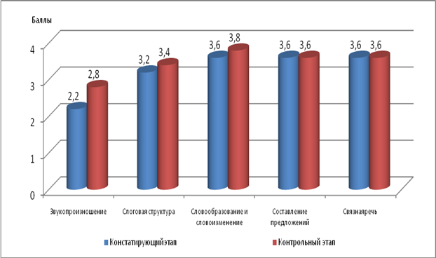 Рис. 2.Результаты констатирующего и контрольного этапов экспериментальной группы Таким образом, сравнив данные контрольного и констатирующего эксперимента, мы отмечаем улучшения состояния произносительной стороны речи у детей данной экспериментальной группы: звукопроизношение на 0,6 баллов, слоговая структура речи на 0,2 балла, словоизменение и словообразование на 0,2 балла. Выводы Экспериментальное обучение показало положительные результаты. Конечное обследование дало возможность говорить о том, что разработанный комплекс логопедической работы способствовал улучшению состояния произносительной стороны речи у детей экспериментальной группы. Заключение В первой главе дипломного исследования были рассмотрены научно-теоретические основы речевого развития дошкольников с дизартрией при ДЦП. Детский церебральный паралич - это тяжелое заболевание, которое возникает у ребенка в результате поражения головного и спинного мозга на ранних этапах его формирования. Основным клиническим симптомом при детском церебральном параличе является нарушение зрения, слуха, речи, интеллекта. У некоторых детей наблюдаются судорожные синдромы. В настоящее время детский церебральный паралич рассматривается как заболевание, возникшее в результате поражения мозга, перенесенного в пренатальный период или период новорожденности. В отечественной клинической практики используются классификация К.А. Семеновой, в которую включены собственные данные и элементы классификации Д.С. Футера и М.Б. Цукера. В данной классификации выделяется пять основных форм детского церебрального паралича: - статистическая диплегия, при данной форме поражены ноги, однако ребенок может научиться частично обслуживать себя. Часто наблюдается задержка психического развития. - гемипаретическая форма детского церебрального паралича в 80 % случаев развивается у ребенка в постнатальный период. При этой форме поражена одна сторона: левая -при правостороннем поражении мозга, правая - при поражении левого полушария. У 25-30 % детей наблюдается дебильность, у 40-50 % -вторичная задержка умственного развития: - гиперкинетическая форма детского церебрального паралича развивается вследствие билирубиновой энцефалопатии, что является гемолитической болезнью новорожденных. У этих больных наблюдаются гиперкинезы, мышечная регидность шеи, туловища, ног; - атонически-астатическая форма характеризуется снижением мышечного тонуса, нарушением координации движений, равновесия; - двойная гемиплегия - самая тяжелая форма, наблюдаются тяжелые речевые нарушения, выраженное снижение интеллекта. У детей с церебральным параличом препятствует нормальному развитию познавательных способностей психоорганический синдром в виде астенических состояний, вегетативных, эмоциональных нарушений, инертности нервных процессов. Наиболее характерны задержки психического развития с точки зрения динамики различных видов мышления. У детей с церебральным параличом наблюдаются затруднения в формировании восприятия формы, соотнесения элементов в пространстве, в правильном восприятии пропорций и перспективы. Интеллектуальная недостаточность при детском церебральном параличе характеризуется недоразвитием пространственного гнозиса и праксиса, функций арифметического счета, страдает распознан