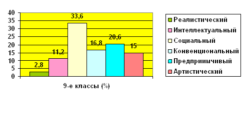 Полученные результаты исследования типов личности учащихся девятых классов по методике Д. Голланда мы представили в виде гистограммы на рис.1.