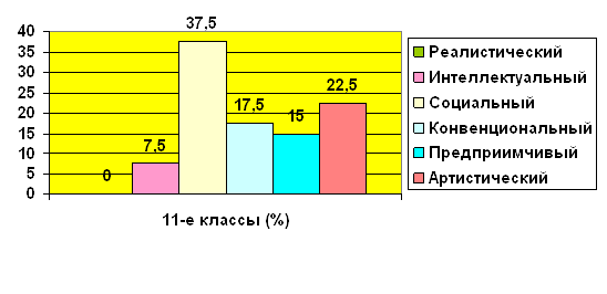 Рис.1. Результаты исследования типов личности по методике Д. Голланда Среди учащихся девятого класса преобладает социальный тип личности – 33,6% учащихся, которые обладают социальными умениями, нуждаются в контактах. У них проявляются такие черты характера, как стремление поучать и воспитывать. Учащиеся с данным типом стараются держаться в стороне от интеллектуальных проблем; активны, но часто зависимы от мнения группы людей. Проблемы решают, опираясь на эмоции, чувства, умение общаться. Обладают хорошими вербальными способностями. Рекомендуемые занятия для таких учащихся: обучение и лечение (учитель, врач, психолог). К предприимчивому типу относится 20,6% учащихся, для них свойственно избирание цели, проявление энергии, импульсивности; им не нравится практический труд, а также занятия, требующие интеллектуальных усилий, усидчивости; хорошо решают задачи, связанные с руководством, статусом и властью, агрессивны; таким людям предпочтительна следующая деятельность: артист, журналист. 16,8% учащихся относится к конвенциональному типу, их определяют как людей, предпочитающих четко структурированную деятельность, не проявляющих критичность, оригинальность, консервативных, зависимых, ригидных (не любят смену деятельности); у них слабо развиты организаторские способности, преобладают математические способности; для таких личностей предпочтительны профессии, связанные с канцелярией и расчетами. К артистическому типу относится 15% учащихся, которые опираются на эмоции, воображение, интуицию; имеют сложный взгляд на жизнь; независимы в решениях, оригинальны; у них высоко развиты моторные и вербальные способности; предпочитают творческие занятия: музыку, рисование, литературное творчество и т.п. К интеллектуальному относится 11,2% учащихся, такие личности несоциальны, аналитичны, рациональны, независимы, оригинальны; у них преобладают теоретические ценности, любят задачи, требующие абстрактные решения, интеллектуальны; также гармонично развиты вербальные и невербальные способности; личности; для них предпочтительные такие научные профессии, как ботаник, астроном, математик, физик. К реалистическому типу личности относится 2,8% учащихся, которые определяются как несоциальные, ориентированные на настоящее, эмоционально стабильные, занимающиеся конкретными объектами (вещами, инструментами, машинами); у них развиты математические, невербальные способности; для таких людей рекомендуются профессии: механик, электрик, инженер, агроном и т.д. Результаты исследования типов личности учащихся 11 классов по методике Д. Голланда мы представили в таблицах 3-4. Таблица 3 Результаты исследования типов личности учащихся одиннадцатых классов по методике Д. Голланда
