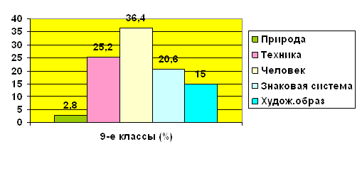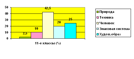 Рис.3. Результаты исследования склонностей к определенному типу профессий учащихся девятых классов по методике ДДО Е.А. Климова Среди учащихся девятого класса преобладает соответствие типу профессий «Человек-Человек» – 36,4% учащихся, которые предпочитают выбирать все профессии, связанные с обслуживанием людей, с общением; к ним относятся педагоги, врачи, психологи и т.п. По типу «Человек-Техника» было выявлено 25,2% учащихся, которым присущи все технические профессии, такие как, например, автомеханик, мастер по ремонту и обслуживанию машин и т.п. По типу «Человек-Знаковая система» – 20,6% учащихся, которым характерны профессии, связанные с расчетами, цифрами и буквенными знаками, в том числе и музыкальные специальности (инженер, графолог). По типу «Человек-Художественный образ» – 15% учащихся, для которых рекомендованы профессии, связанные с творчеством (актеры, художники).По типу профессии «Человек-Природа» 2,8% учащихся, для которых предпочтительны занятия, связанные с растениеводством, животноводством и лесным хозяйством (агроном, ветеринар, лесничий). Проведя исследование с учащимися одиннадцатых классов по методике ДДО Е.А. Климова, мы получили результаты, которые представлены в таблицах 7 – 8. Таблица 7 Результаты исследования склонностей к определенному типу профессий учащихся девятых классов по методике ДДО Е.А. Климова