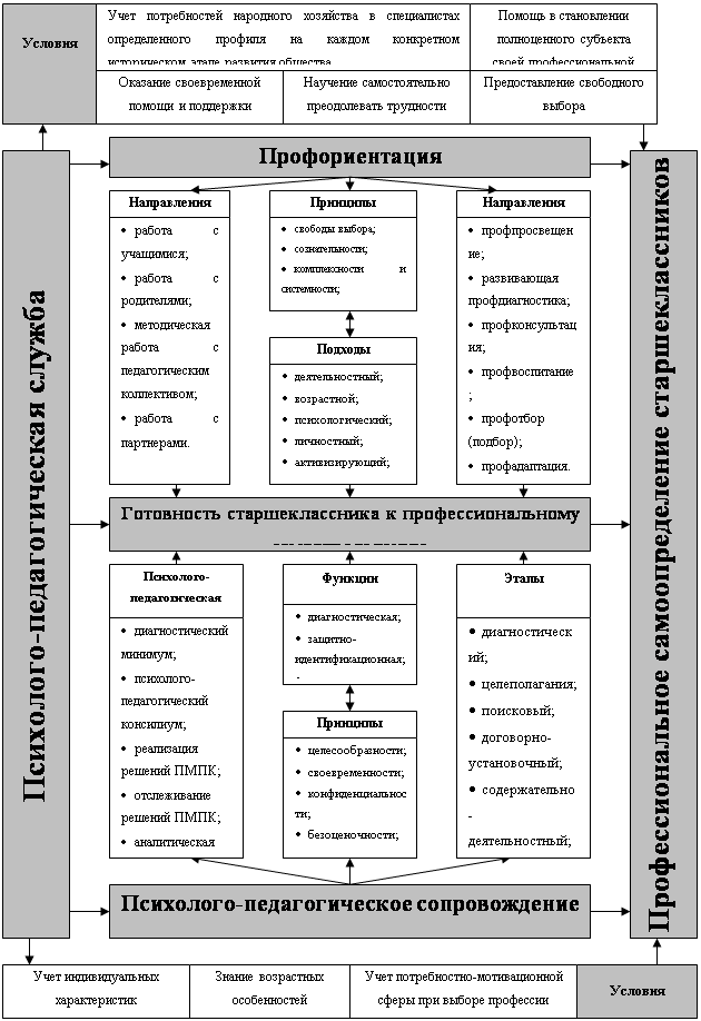 Дипломная работа: Место и роль моделей психолого-педагогического сопровождения профессионального самоопределения детей старшего школьного возрастаДипломная работа: Место и роль моделей психолого-педагогического сопровождения профессионального самоопределения детей старшего школьного возрастаСОДЕРЖАНИЕ Введение Глава І. Теоретический обзор научной литературы по проблеме психолого-педагогического сопровождения профессионального самоопределения старшеклассников 1.1 Сущность психолого-педагогического сопровождения 1.2 Особенности профессионального самоопределения старшеклассников 1.3 Психолого-педагогическое сопровождение профессионального самоопределения старшеклассников 1.4 Выводы по 1 главе Глава ІІ. Эмпирическое исследование психолого-педагогического сопровождения профессионального самоопределения старшеклассников 2.1 Цель, методы и процедура исследования 2.2. Анализ и обсуждение результатов 2.3 Модель психолого-педагогического сопровождения профессионального самоопределения старшеклассников Заключение Литература Приложение ВВЕДЕНИЕ Профессиональное самоопределение связано с глубокими, сильными, эмоциональными переживаниями развивающегося человека; здесь возникают серьезные нарушения внутреннего мира развивающегося человека, так как в жизни большинства людей это первый нормативный выбор, т.е. обязательный вынужденный выбор, от которого нельзя уйти (хотя можно отложить). Этот момент жизни является переломным для социальной позиции. Проблема в том, что необходимо, завершая определенный этап своей жизни, определить дальнейший путь, причем ответственность ложится на его собственные плечи. Следовательно, в контексте изучения проблемы профессионального самоопределения, определение личностного «Я» является первичным. Одним из важнейших факторов самоопределения в педагогической науке выделилось психолого-педагогическое сопровождение. Психолого-педагогическое сопровождение оптантов (термин Е.А.Климова) рассматривалось в контексте изучения профессиональной направленности личности и ее формирования в школьные годы (В.И. Журавлев, А.И. Смирнов, Е.А. Климов); в изучении интересов к определенной профессии (Я.Л. Коломенский, В.Г. Немировский, Л.В. Сохань и др.); психологических предпосылок профессионального самоопределения (А.Б. Орлов, В.Ф. Сафин, М.В. Кириллова, Е.А. Климов и др.); в изучении возможностей построения путей жизненной программы (Н.И. Соболева, А.Ю. Винокур, Н.С. Пряжников и др.). В этой связи ситуация выбора профессии после окончания школы традиционно рассматривается в контексте психологии труда и профессионального обучения. Такой взгляд представляется односторонним, не учитывающим то воздействие, которое оказывает данная проблема и ее разрешение на весь жизненный путь человека. Знания об огромном множестве профессий не делает их автоматически альтернативами профессионального самоопределения. Сделав выбор, большинство учащихся оказываются не готовыми к принятию ответственности за него. Актуальность исследования заключается в изучении противоречий между динамично изменяющейся ситуацией на рынке труда и навыками самоопределения учащихся. С одной стороны, современный рынок труда характеризуется широкой палитрой профессиональной сферы, ежегодно пополняющейся новыми специальност