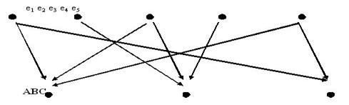 Рис. 2. Очевидно, что существует множество других вариантов задания исходов при подбрасывании кубика. Множество исходов испытания, которое содержит максимальное число возможных исходов, называется базовым множеством, а все остальные множества исходов, полученные из базового путем объединения его исходов, - сокращенным. При подбрасывании игрального кубика базовое множество насчитывает шесть элементов (е1 ,е2 ,е3 ,е4 ,е5 ,е6 ), а сокращенные множества могут содержать от двух до пяти элементов. Понятие базового и сокращенного множества исходов удобны при рассмотрении урновых испытаний. Пусть, например, из урны с тремя белыми и четырьмя черными шарами наугад извлекают шар. Если бы все семь шаров были бы пронумерованы, т.е. различимы, то можно было бы говорить о базовом множестве исходов этого испытания, насчитывающем семь элементов. Но шары одного и того же цвета неразличимы. Поэтому в таком испытании задается сокращенное множество исходов: е1 – Б(достали белый шар),е2 – Ч(достали черный шар). Указанные исходы, по сути, являются событиями. Первому событию благоприятствуют три исхода из базового множества, связанные с извлечением белых шаров, а второму – четыре исхода из базового множества, связанные с извлечением черных шаров. С помощью графических изображений удобно объяснять совместность и несовместность событий, а также их противоположность. Если в ходе испытания совместное осуществление событий А и В невозможно, то события А и В называются несовместными. В этом случае ни один из исходов испытания не благоприятствует одновременному появлению события А и события В. Если же в ходе испытания не благоприятствует одновременному появлению событий А и В возможно, то события А и В называются совместными, и, по крайней мере, один из исходов испытания благоприятствует одновременному появлению этих двух событий [24]. Пример 3. Укажите, какие из изображенных на рис.3 событий являются совместными, а какие – несовместными. Решение. События А и В – совместные (общий исход е3), А и С – совместные (общий исход е1 и е3 ), В иС – несовместные ( нетобщих исходов).