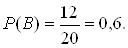 Мы видим, что сумма очков 7 есть более вероятное событие, чем сумма очков 8. Интересно отметить, что этот факт был замечен игроками в кости. Попытки его объяснить (и решение ряда задач по страхованию и т. п.) привели к созданию математической теории — начал теории вероятностей. Задание 2. В ящике лежат 20 одинаковых на ощупь шаров. Из них 12 белых и 8 черных. Наугад вынимают один шар. Какова вероятность того, что он окажется белым? (Точный смысл выражения «наугад вынимается шар» будет выяснен в процессе решения.) Решение. В этой задаче рассматривается следующий опыт: из ящика наугад вынимают шар и смотрят его цвет. Сразу напрашивается множество исходов, состоящее из двух событий: Ч= «вынутый шар черный» и Б = «вынутый шар белый». Но эти исходы неравновероятны, так как белых шаров больше и шансов вынуть белый шар больше. Для выявления в этом опыте множества равновероятных исходов внесем в опыт дополнительный элемент, не нарушающий вероятностной структуры задачи, а именно, перенумеруем все шары. Белым шарам поставим в соответствие номера с 1 по 12, а черным — номера с 13 по 20. События «вынут шар с номером k»=АKуже равновероятны, так как шары на ощупь неотличимы и вынимаются наугад. Кроме того, эти 20 событий образуют множество исходов нашего опыта. Следовательно, п = 20, а интересующему нас событию В благоприятствуют первые 12 исходов, т. е. т =12. Следовательно,