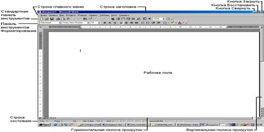 Рисунок 1. Окно программы MS Word Учитель должен задавать вопросы о названии и описании каждого элемента рабочего окна программы, дополнять и уточнять ответы учащихся. Для того чтобы учащиеся лучше запомнили материал, предлагаем использовать визуальный стимул в виде следующей таблицы (см. таблицу 1). Таблица 1. Структурные элементы интерфейса