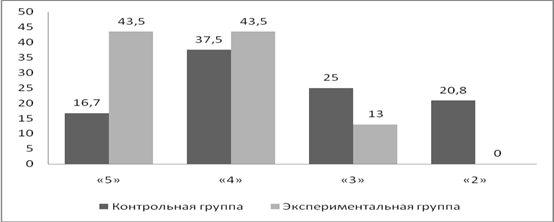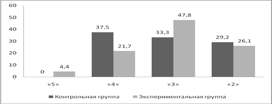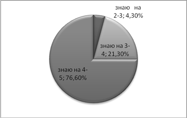Рисунок 2. Гистограмма уровня обученности учащихся контрольной и экспериментальной групп до начала экспиремента (в процентах) Результаты предварительного контроля показали, что средний балл учащихся около «тройки». Это доказывает, что у учащихся имеются некоторые знания по теме, но они находятся на низком уровне. Однако сами учащиеся считают, что практически в совершенстве владеют знаниями и навыками, связанными с вопросами работы с текстовым процессором. На этапе предварительного контроля мы предложили учащимся оценить уровень их знаний по пятибалльной шкале. Результаты опроса представлены в диаграмме (см. рисунок 3).