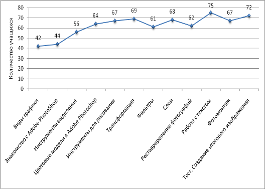 Таким образом, по данным экспериментальной проверки, проведенной в школе № 178 г. Москвы, позволяют сделать вывод об эффективности разработанной методики преподавания темы «Графический редактор Adobe Photoshop».