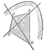 Рис. 1.1.13 Мы получим выпуклую совокупность лучей. В самом деле, если ОА и ОВ — два луча данной совокупности (А и В — точки фигуры Ф), то все лучи, расположенные внутри острого угла АОВ, пересекают отрезок АВ, целиком состоящий из точек фигуры Ф, и, следовательно, принадлежат данной совокупности. [8, 22] Получившаяся совокупность лучей не может быть единственным лучом или парой лучей, составляющих продолжение один другого, так как считается, что фигура не одномерна. Нетрудно так же показать, что эта совокупность лучей не может заполнить всю плоскость. Действительно, если лучи заполняют плоскость, то среди них можно выбрать две такие пары лучей ОА и ОВ, ОС и ОD, что лучи каждой пары, составляют продолжение один другого. Пусть А, В, С, D—точки выпуклой фигуры, лежащие на этих лучах (рис. 1.1.14). Фигура Ф вместе с точками А, В, С должна содержать весь треугольник АВС (см. рис. 1.1.14) и вместе с точками А, В, D—весь треугольник АВD, т. е. она должна содержать весь выпуклый четырехугольник АСВD, для которого точка О является внутренней. Таким образом, в этом случае точка О не может быть граничной точкой фигуры Ф. [8, 23]
