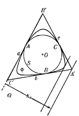 В, и не может быть меньше Если же вписанная окружность S фигуры Ф содержит три граничные точки А, В, С фигуры Ф, являющиеся вершинами остроугольного треугольника, то опорные прямые фигуры Ф, проведенные в точках А, В, С, образуют некоторый треугольник А’В’С’, описанный одновременно вокруг Ф и вокруг окружности S (рис. 1.3.11, б). Обозначим стороны этого треугольника через а, b, с (а — наибольшая сторона), а соответствующие высоты — через ha, hb, hc. Площадь