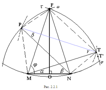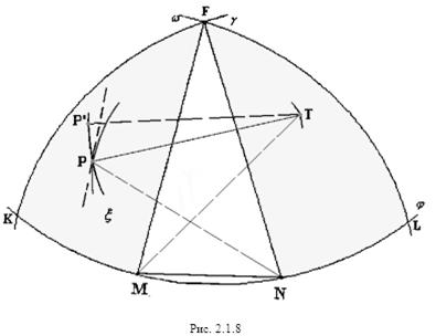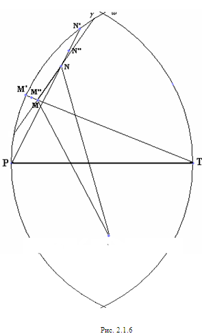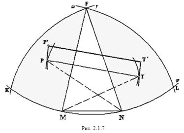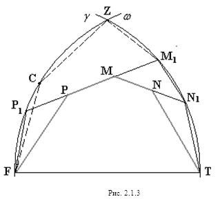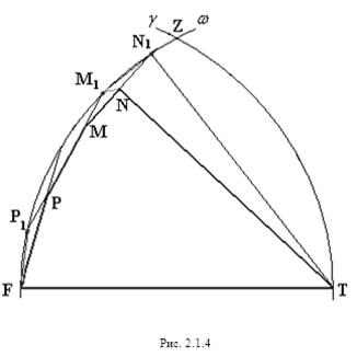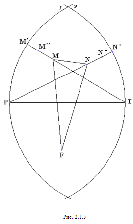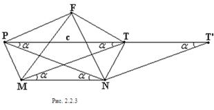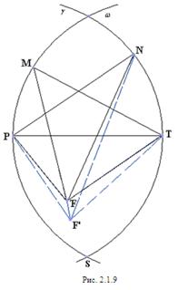 отрезком РТ и дугами Предположив, что NF<1 и MF<1 и заменив точку F близкой точкой F’ (см. рис. 2.1.9), мы получим, что РF+FТ<PF’+F’T, т.е. периметр пятиугольника MPF’TN больше периметра исходного пятиугольника MPFTN.