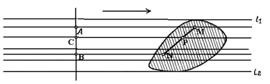 Теорема 1.1.1. К каждой ограниченной выпуклой фигуре можно провести в точности две опорные прямые, параллельные данному направлению. Доказательство. Для того чтобы это доказать, проведем через каждую точку ограниченной выпуклой фигуры Ф прямую, параллельную данному направлению (рис. 1.1.9). Все эти прямые пересекают произвольную прямую, перпендикулярную к выбранному направлению, по одномерной выпуклой фигуре (если А и В — две произвольные точки пересечения нашей совокупности прямых с перпендикулярной к ним прямой, а С—произвольная точка отрезка АВ, то С тоже должна принадлежать этому пересечению; это нетрудно видеть из рис. 1.1.9, если воспользоваться выпуклостью фигуры Ф). Следовательно, это пересечение должно быть отрезком прямой линии (ограниченность пересечения вытекает из ограниченности фигуры Ф), а совокупность прямых, параллельных заданному направлению, проведенных через все точки Ф, должна представлять собой полосу. Крайние (граничные) прямые l1 и l2 этой полосы и являются двумя опорными прямыми, параллельными заданному направлению.