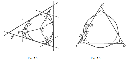 высота В том случае, когда вписанная в выпуклую фигуру Ф окружность S содержит три граничные точки Ф, являющиеся вершинами остроугольного треугольника, существует треугольник А’В’С’, описанный одновременно вокруг Ф и вокруг S. Отсюда следует, что в этом случае вписанная окружность S является единственной — всякая другая окружность, содержащаяся внутри Ф, должна также содержаться внутри треугольника А’В’С’ и, следовательно, будет меньше, чем окружность S, вписанная в треугольник А’В’С’. Однако, если вписанная окружность соприкасается с границей Ф в двух диаметрально противоположных точках, то она может быть и не единственной (см. рис. 1.3.1). [8, 250] Задача №1.3.3 Прежде