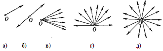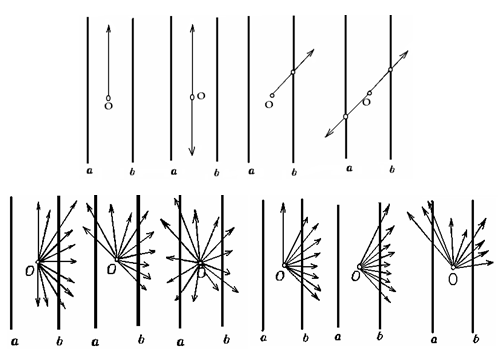 Рис. 1.1.11 Доказательство. В самом деле, из определения выпуклой совокупности лучей непосредственно следует, что пересечение такой совокупности с любой прямой, не проходящей через точку О, выпукло. Рассматривая пересечения выпуклой совокупности лучей, с двумя параллельными прямыми, расположенными по разные стороны от точки О, и учитывая, что каждое из этих пересечений может совсем не содержать точек, быть единственной точкой, отрезком, лучом или всей прямой, нетрудно выяснить, что выпуклая совокупность лучей может быть только одного из перечисленных выше видов; все возможные здесь случаи приведены на рис. 1.1.12. [8, 21]