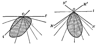 Рис. 1.1.14 Следовательно, рассматриваемая совокупность лучей будет либо полуплоскостью, либо углом, меньшим 180°. В первом случае (рис. 1.1.15) точка О называется обыкновенной точкой выпуклой кривой К, ограничивающей фигуру Ф. Прямая Г, ограничивающая полуплоскость, является опорной прямой фигуры Ф (все точки Ф лежат на лучах нашей совокупности, а следовательно, с одной стороны от прямой Г).