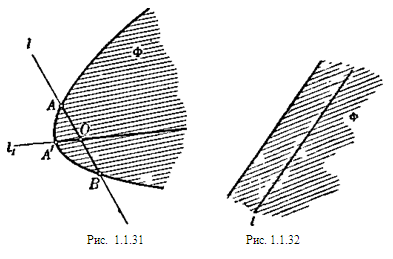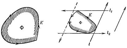 Рис. 1.1.17 Сопоставляя оба случая — случай обыкновенной точки выпуклой кривой и случай угловой точки, приходим к заключению, что через каждую точку выпуклой кривой проходит, по крайней мере, одна опорная прямая. [1, 41] Определение 1.1.19. Ограниченная фигура называется выпуклой, если через каждую ее граничную точку проходит, по крайней мере, одна опорная прямая. [8, 26] Пусть Ф — произвольная ограниченная выпуклая фигура, К— ее граница. Установим на кривой К определенное направление обхода, например, против часовой стрелки. При движении по кривой К в этом направлении фигура Ф все время остается слева (рис. 1.1.18). В соответствии с этим установим направления и на опорных прямых фигуры Ф. Будем выбирать направление опорной прямой l фигуры Ф таким образом, чтобы фигура Ф лежала слева от прямой l (рис. 1.1.19).